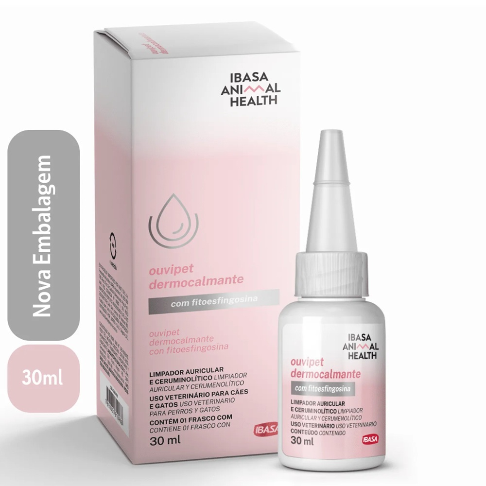 higienizador auricular Ibasa, Ouvipet dermocalmante, fitoesfingosina pet, limpeza de ouvido cães e gatos, cuidado auricular pet sensível.